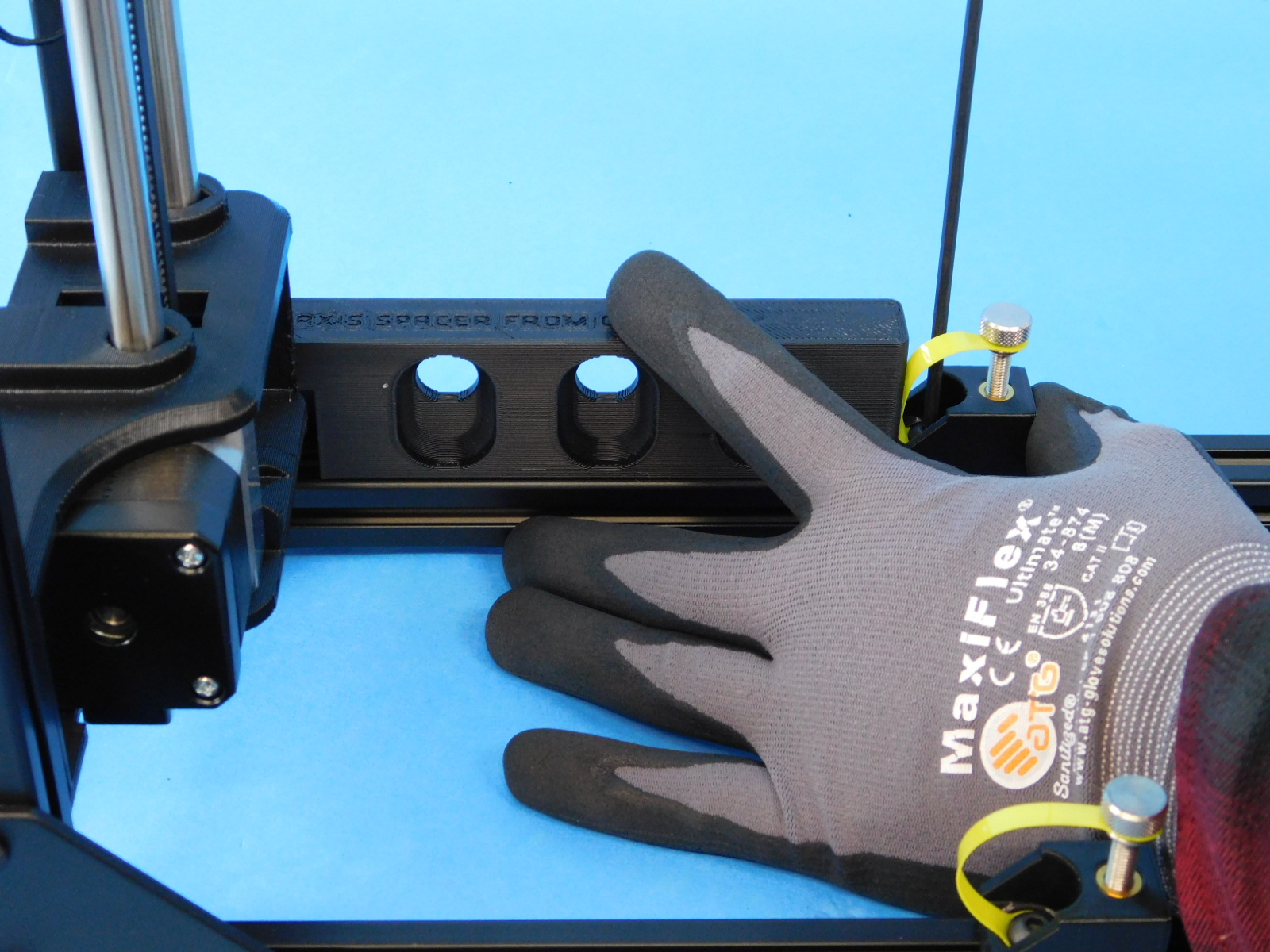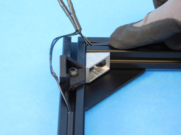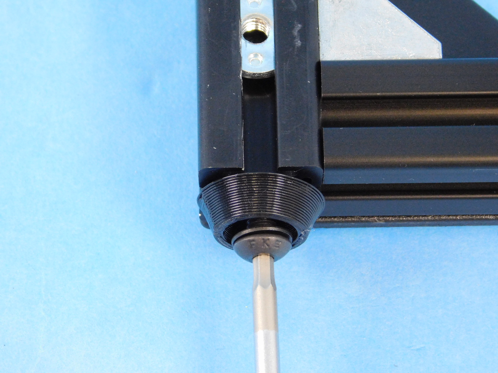 Using one [HD-BT0225] M5x10 stainless steel BHCS and one [HD-WA0007] M5 stainless washer, fasten the [HD-EX0092] aluminum corner bracket to the top most t-slot nut on the photo right side of the frame.