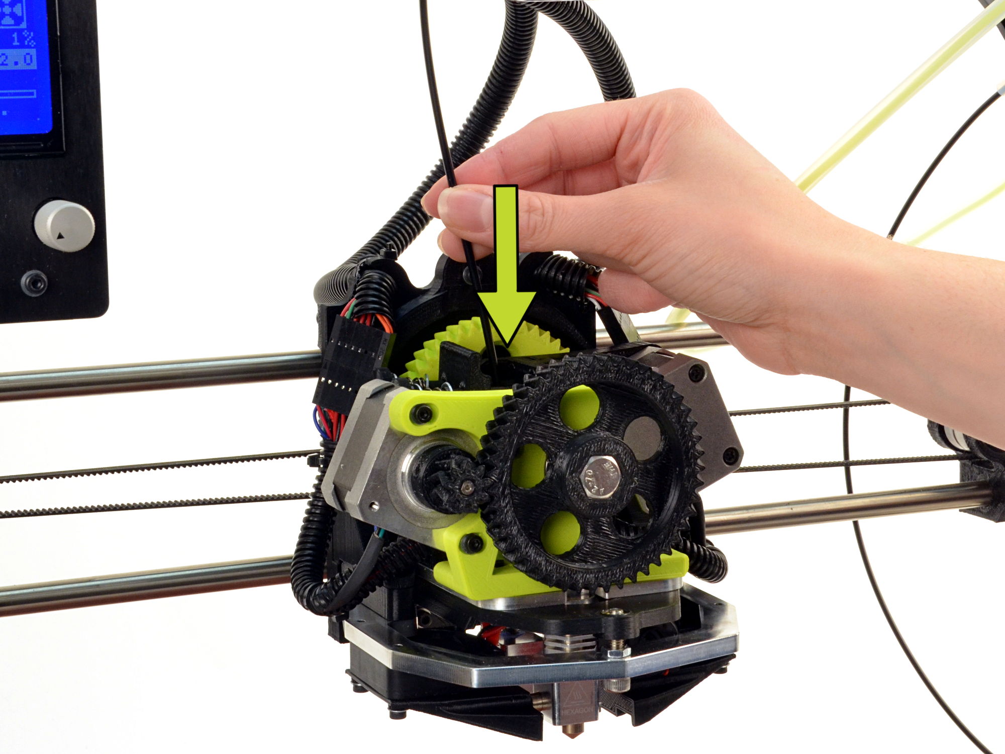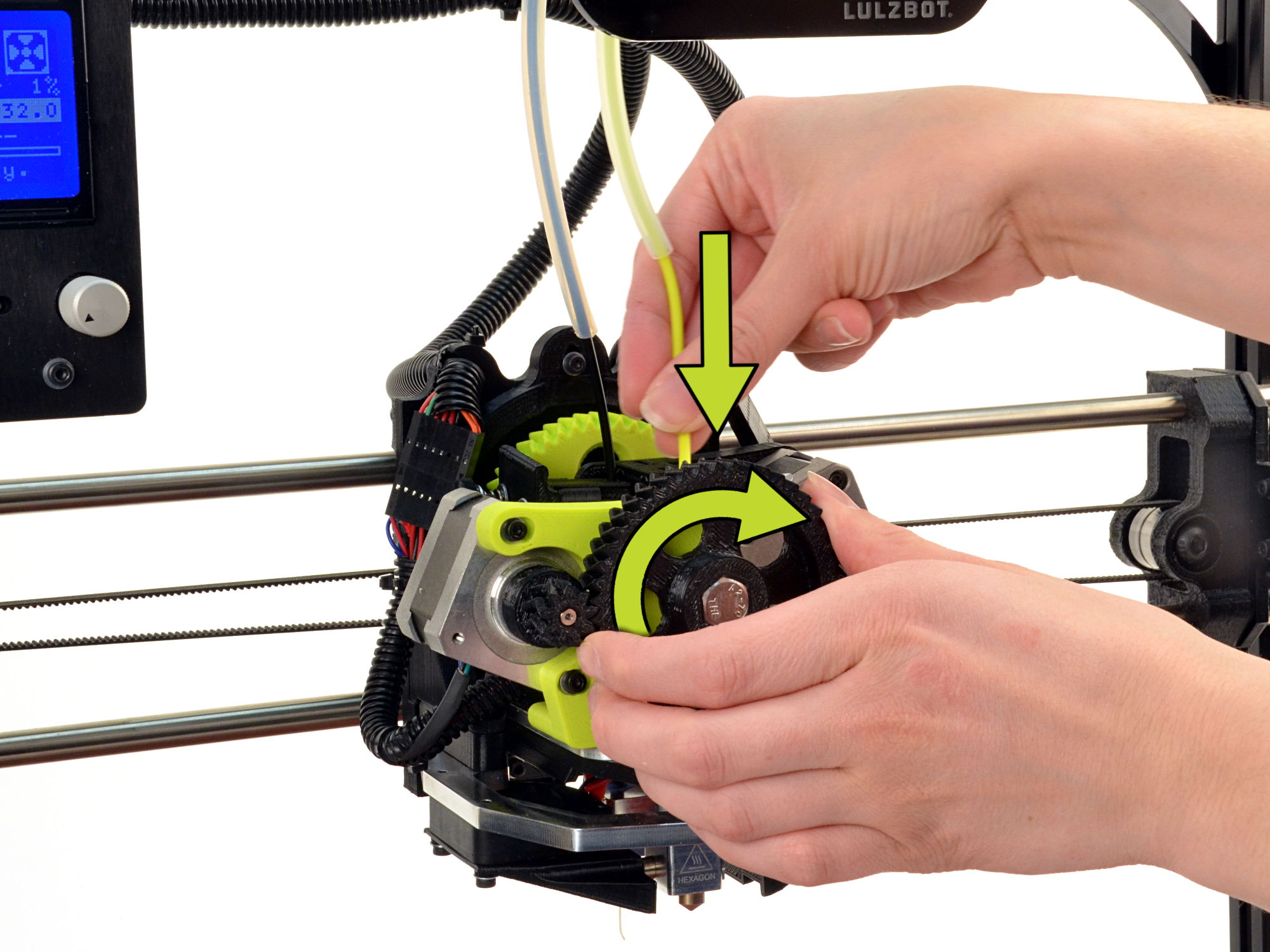 Purge the calibration filament by rotating each large gear by hand until the extruder transitions to the sample filament.
