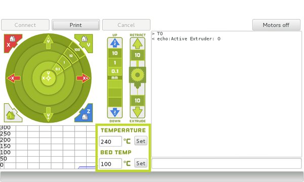 Set Extruder 0 (rear) hot end temperature to 240°C and the print surface to 100°C by using the Set buttons.