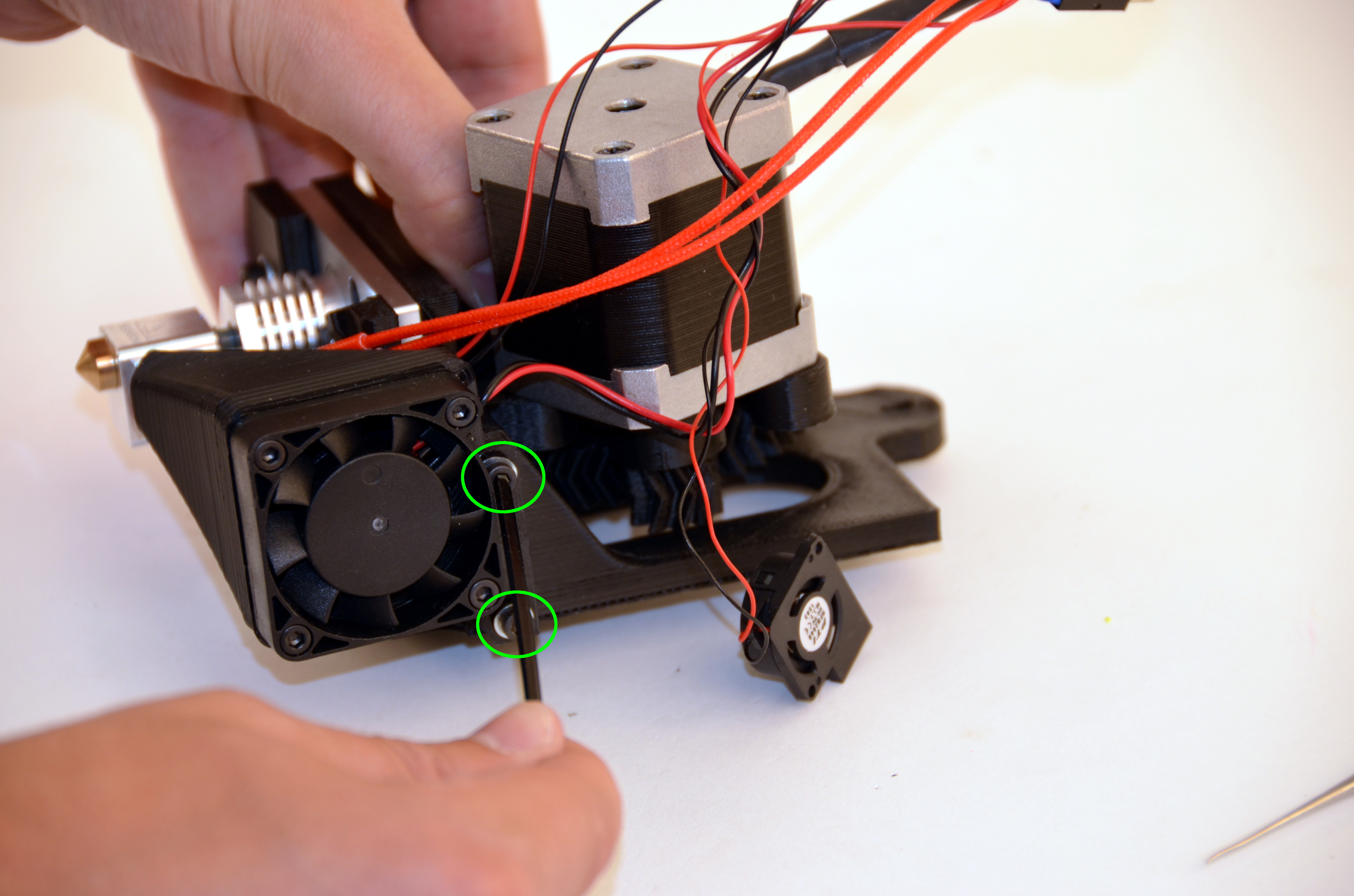 Install the 2 M3x15mm screws from the underside of the tool head, through the hot end mounting plate and into the extruder body by using the 4mm driver. Torque to 6 in*lbs.