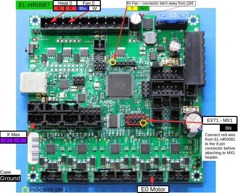 Plug in ELHR0087 CB Extruder Harness into RAMBo then pass its 20 position connector through the interconnect housing transition- Connect the single black wire with connector to the single red wire from EL-HR0081, insert red wire into connector position 1 which is marked MX