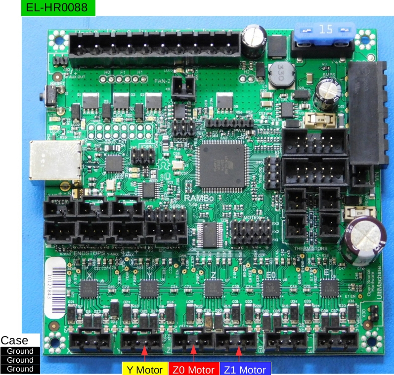 Install the Dual Extruder harness (EL-HR0101) from the inside the case, set the orientation of the connector so socket #5 (empty socket) of the connector is away from the USB connector; secure the connector with 3x- 18-8 FHS Black Oxide; tighten to 3in*lbs; Connect the cable to the RAMBo
